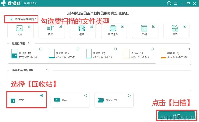 步骤2:勾选上要恢复的文件类型,并勾选上【回收站】 ,单击【扫描】 ;