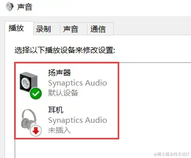 第3步:在播放窗口,查看是否正确选择了要使用的声音设备。