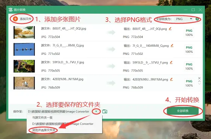怎么把图片转换成png格式?要将多张图片转换成PNG格式,你可以使用数据蛙视频转换器。该软件能够高效、稳定地完成图片格式转换任务,确保转换过程流畅,不会出现卡顿或崩溃的情况。它支持批量转换功能,可以同时转换多张图片,大大提高了工作效率,节省了时间。