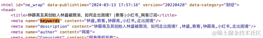 这看起来似乎有一点奇技淫巧的味道,事实上这是顶级搜索引擎谷歌也在使用的解决方案。熟悉 SEO 的朋友一定不会对 TKD 陌生,TKD 分别是:Title(标题),Keywords(关键词),Description(描述/摘要)的英文首字母。我们随便截一张网易新闻的源码图看看:
