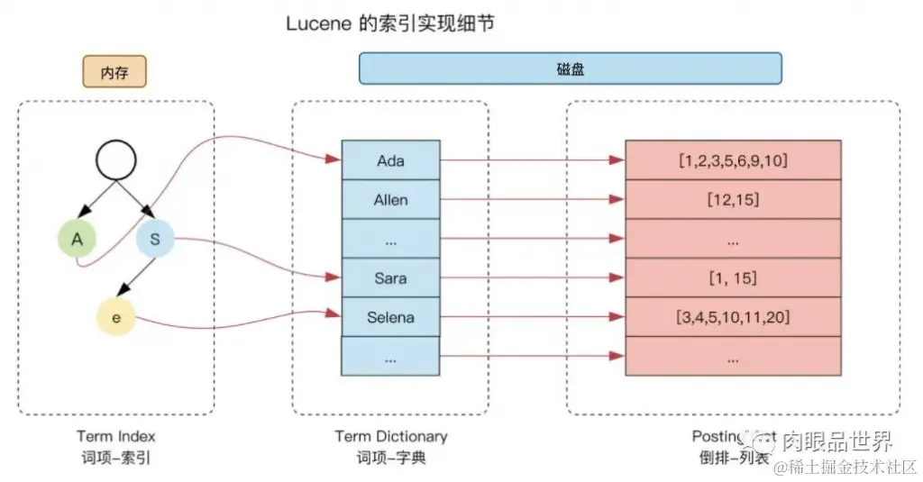 下面是 elasticsearch 内核Lucene的倒排索引示意图