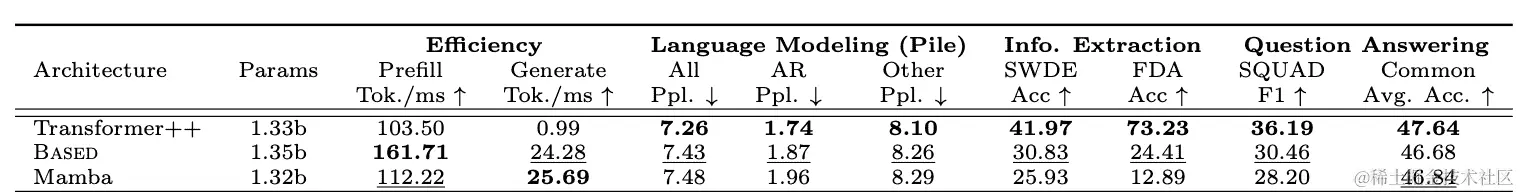 尽管它很简单,在真实的语言建模实验中(至少达到 13 亿参数),Based 在整体 Pile 困惑度和来自LM eval harness的标准零-shot 基准方面与 Mamba 竞争力相当(显示在问答-常见中)。