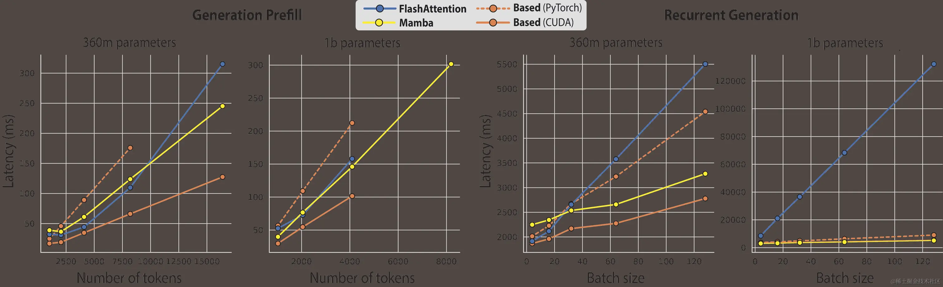 然后,我们使用我们的 IO 感知算法比较 FlashAttention-2、Mamba 和 Based 360M 和 1.3Bn 参数模型的端到端生成速度。我们将批处理大小保持为 2 以进行预填充,并为下一个标记预测生成 1024 个标记。令人惊讶的是,Based 的吞吐量比 FlashAttention-2 高出多达 24 倍!