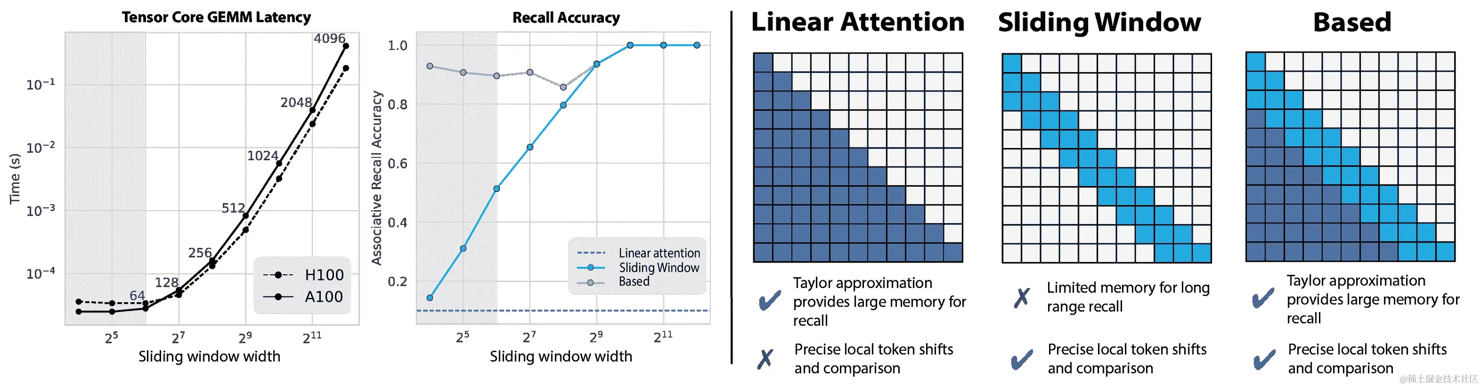 滑动窗口注意力可以执行关联召回所需的精确局部移位。我们在实验中使用小窗口大小(例如 64),与Mistral-7B和最近提出的Griffin等架构中较大的窗口大小形成对比。直观上,更多的注意力(更大的窗口大小)从质量的角度来看是好的,但我们希望在质量和挂钟速度之间取得平衡。为了平衡这些目标,让我们看看上图中的左图。观察到 16x16 与 64x64 矩阵的矩阵乘法延迟大致相等,超过 64 后,延迟随窗口大小呈非线性增长。请注意,16x16 和 64x64 之间的粗略相似性是因为后者保持了 GPU 张量核心的占用率足够高,以使其饱和!