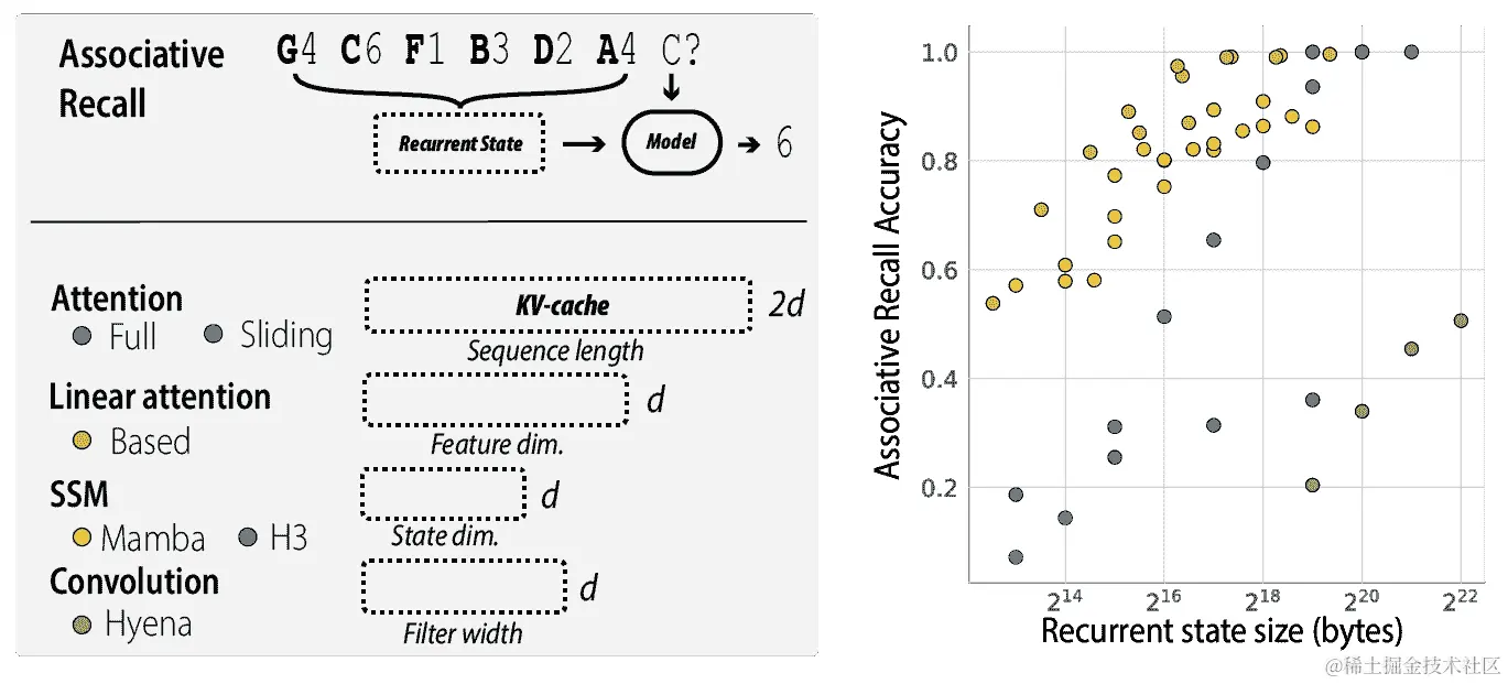 在注意力中,状态通常被称为 KV 缓存,并随着序列长度增长。在图 1 的右上角,我们可以看到注意力完美地执行召回,尽管以巨大的循环状态为代价。滑动窗口注意力提供了一种限制 KV 缓存大小的方法,但我们发现(并不奇怪)随着我们减少循环状态的大小(例如从 1MB 循环状态到 65KB 循环状态),召回性能会迅速下降(图 1,浅蓝色)。
