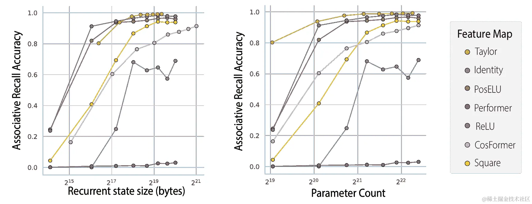 我们选择特征化与扩展状态大小对 Based 质量的影响有多大? 模型有效使用状态的能力至关重要。在准确度与循环状态大小权衡曲线中,几种替代泰勒映射的模型都落在帕累托前沿以下。下面我们将其与使用学习投影扩展状态大小然后应用文献中的流行特征映射(Performer、CosFormer、PosELU)的模型进行比较。我们在MQAR 合成测试上训练这些模型,为图中所示的所有点扫描超参数(学习率),发现泰勒映射最有效。这一趋势延续到 Pile 语言建模语料库的真实世界实验中(更多内容请参阅我们的论文)。