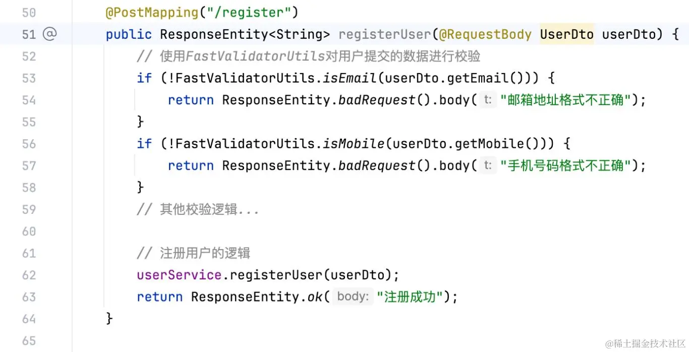 当请求到达Controller方法时,Spring框架会自动对UserDto对象的属性进行校验,确保它们符合我们定义的校验规则。如果校验失败,则会抛出异常并返回对应的错误信息。