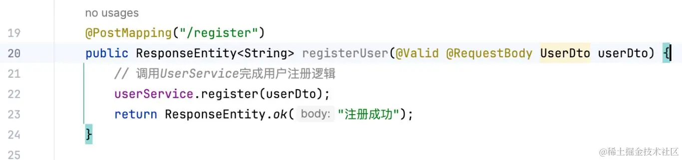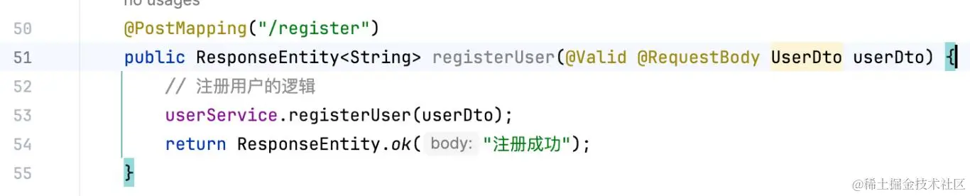 然后,在Controller方法中,我们可以直接将UserDto对象作为方法的参数,并在参数上使用 @Valid注解来启用参数校验功能。