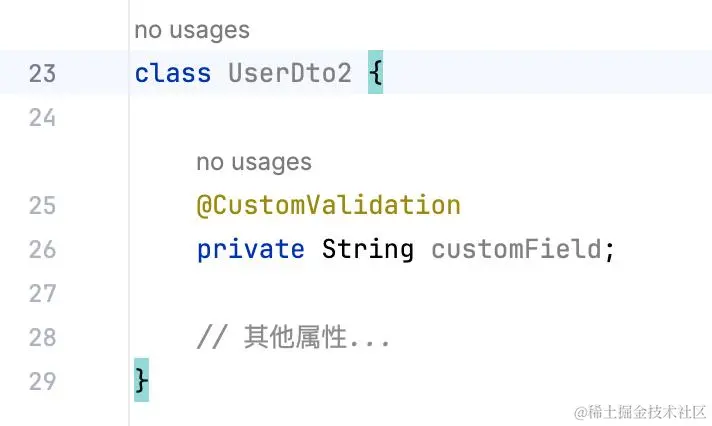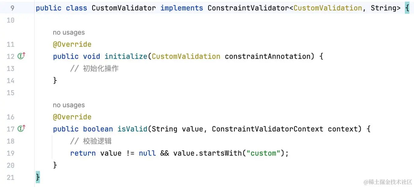 在上面的示例中,我们自定义了一个校验注解 @CustomValidation,并实现了一个校验器类CustomValidator,用于校验字符串是否以"custom"开头。在实际应用中,我们可以将这个自定义注解应用到我们的实体类属性上,比如: