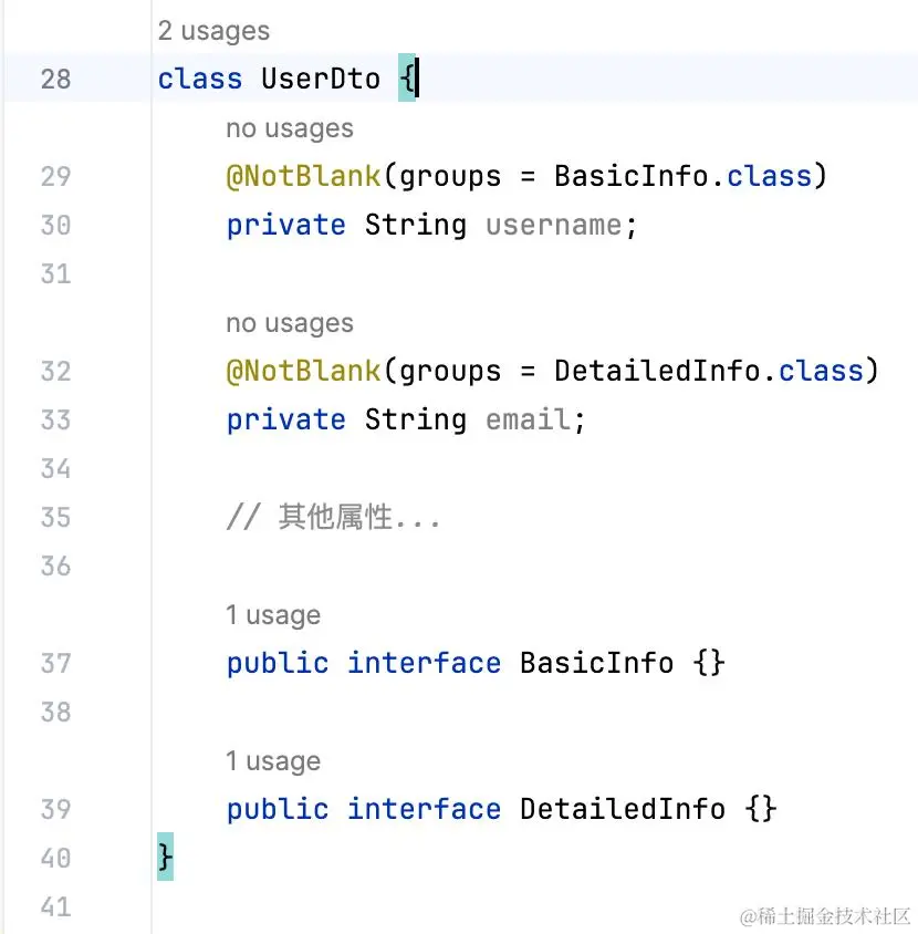 在上面的示例中,我们定义了两个分组:BasicInfo和DetailedInfo。username属性属于BasicInfo分组,email属性属于DetailedInfo分组。这样一来,在进行参数校验时,我们就可以根据不同的分组指定不同的校验规则,比如: