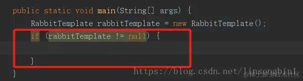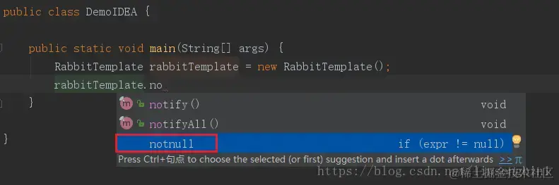 当我们使用rabbitTemplate. 后,直接输入notnull并回车,IDEA就好自动生成if判断了。