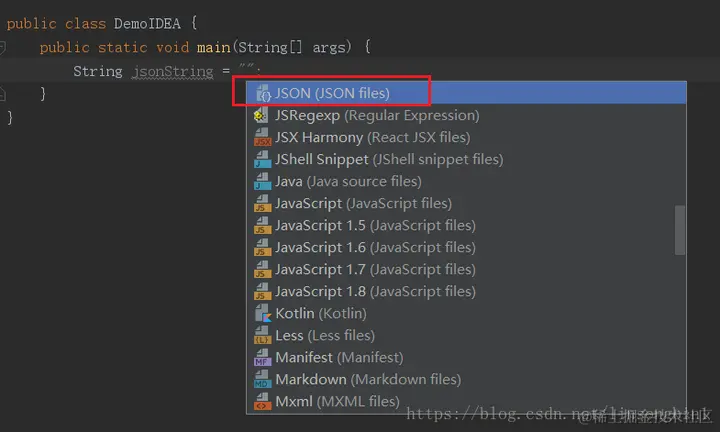 先将焦点定位到双引号里面,使用alt+enter快捷键弹出inject language视图,并选中
