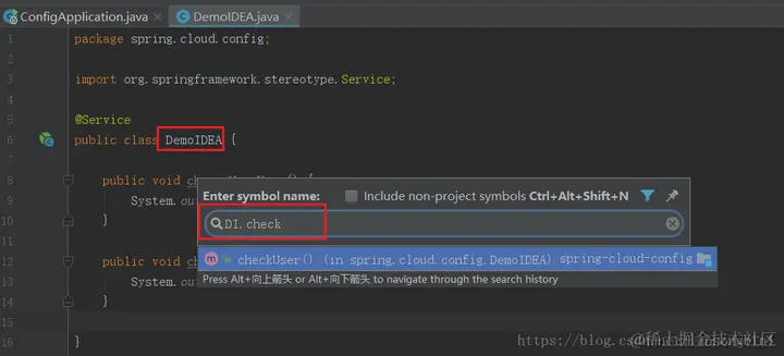 你想找到checkUser方法。直接输入user即可。