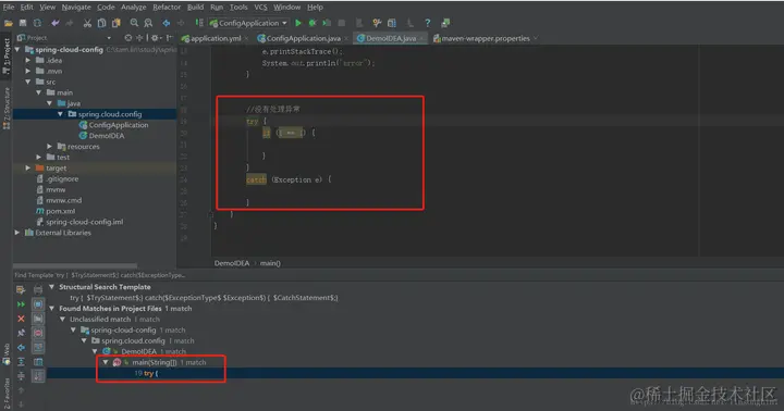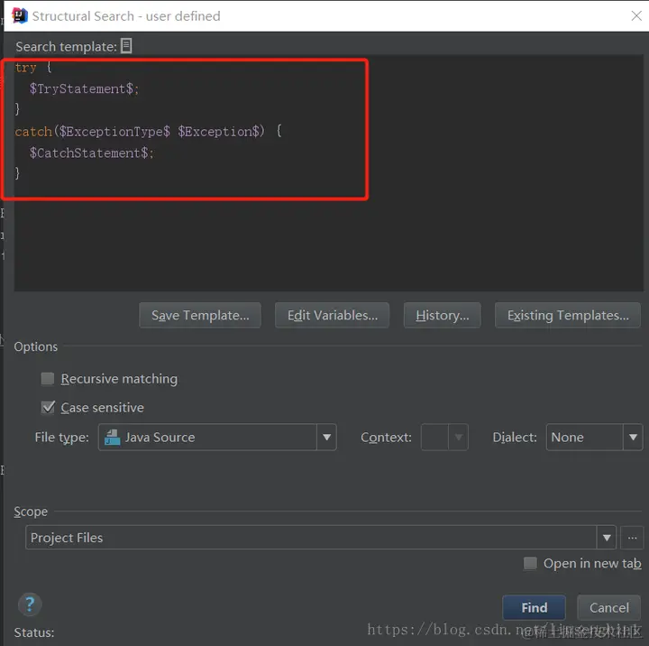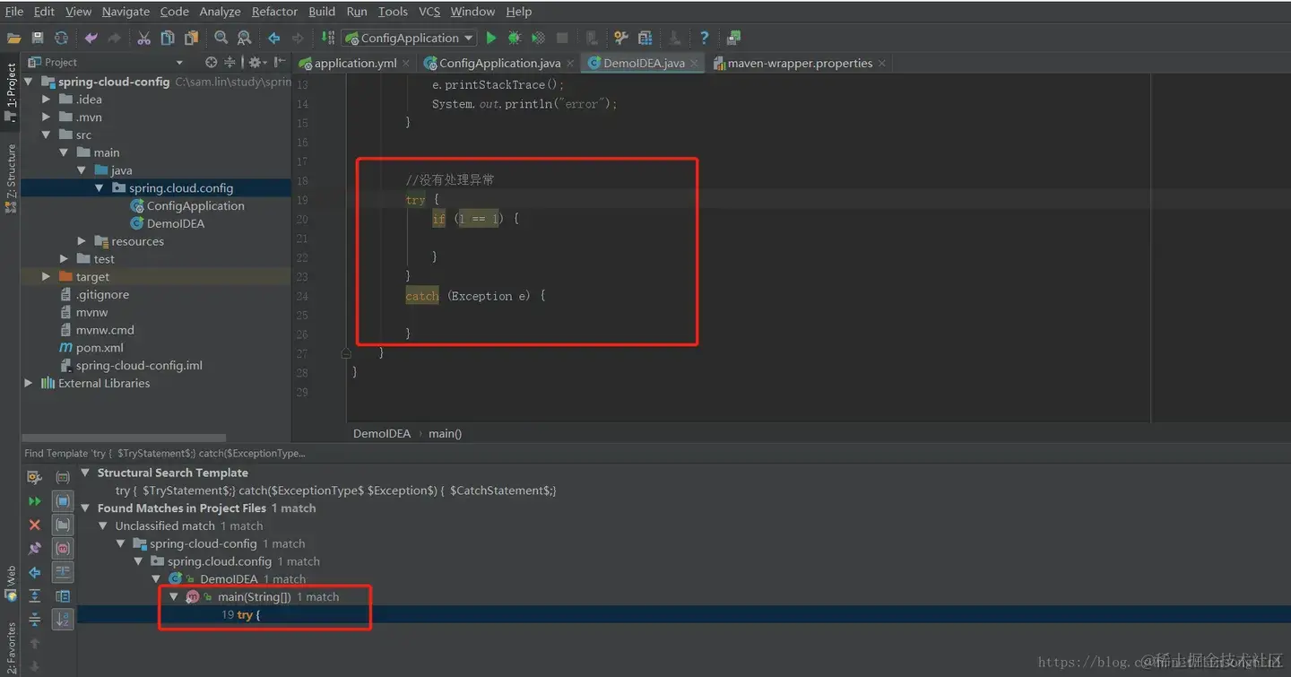 想在整个工程里面找到所有的try catch语句,但是catch语句里面没有做异常处理的。