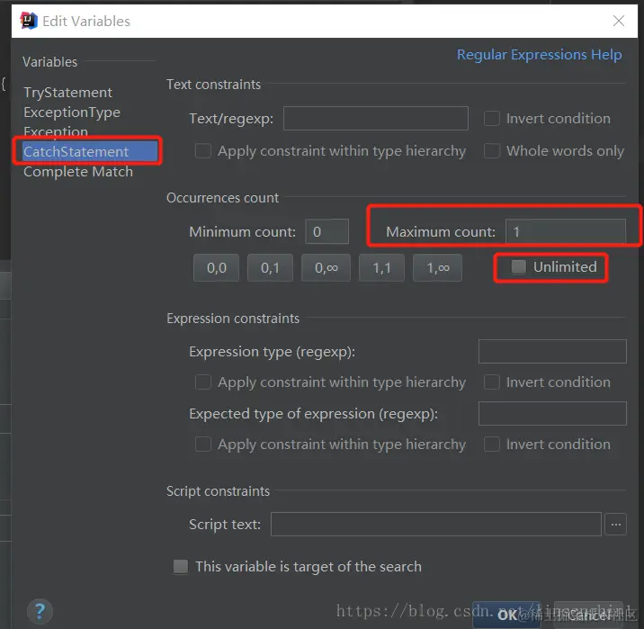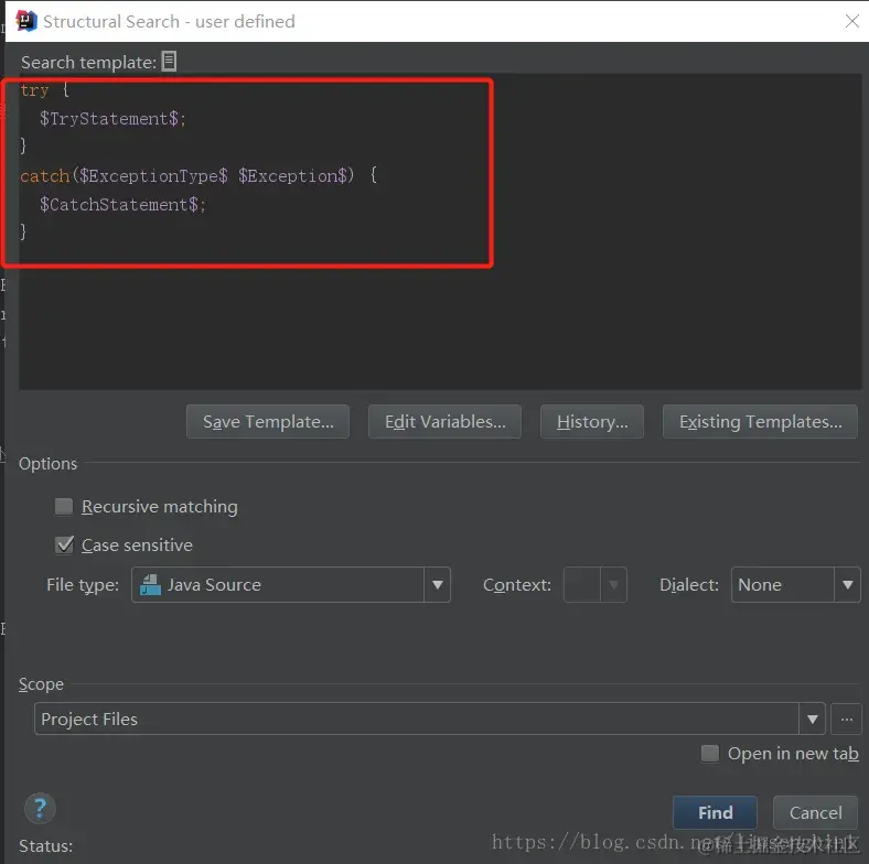 点击Existing Templates按钮,选择try模板。为了能找出catch里面没有处理异常的代码块,我们需要配置一下CatchStatement的Maximum count的值,将其设置为1。