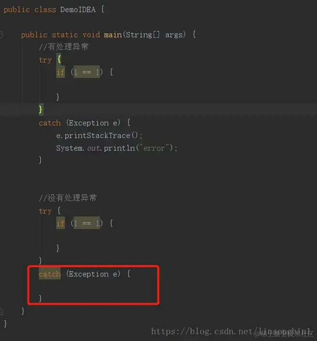catch语句里没有处理异常,是极其危险的。我们可以IDEA里面方便找到所有这样的代码。