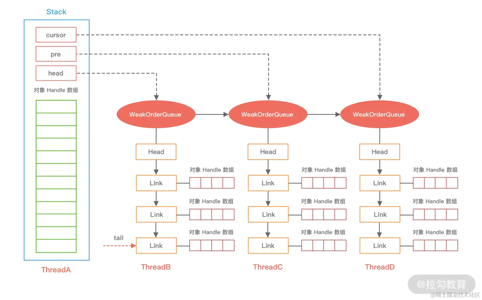 为了无锁化操作,netty为其它每个线程都设计了一个WeakOrderQueue,各个线程只会操作自己的WeakOrderQueue,不会有并发问题了。其它线程的WeakOrderQueue会通过指针构成一个链表,Stack对象内部通过3个指针指向链表,这样就可以遍历整个链表对象。