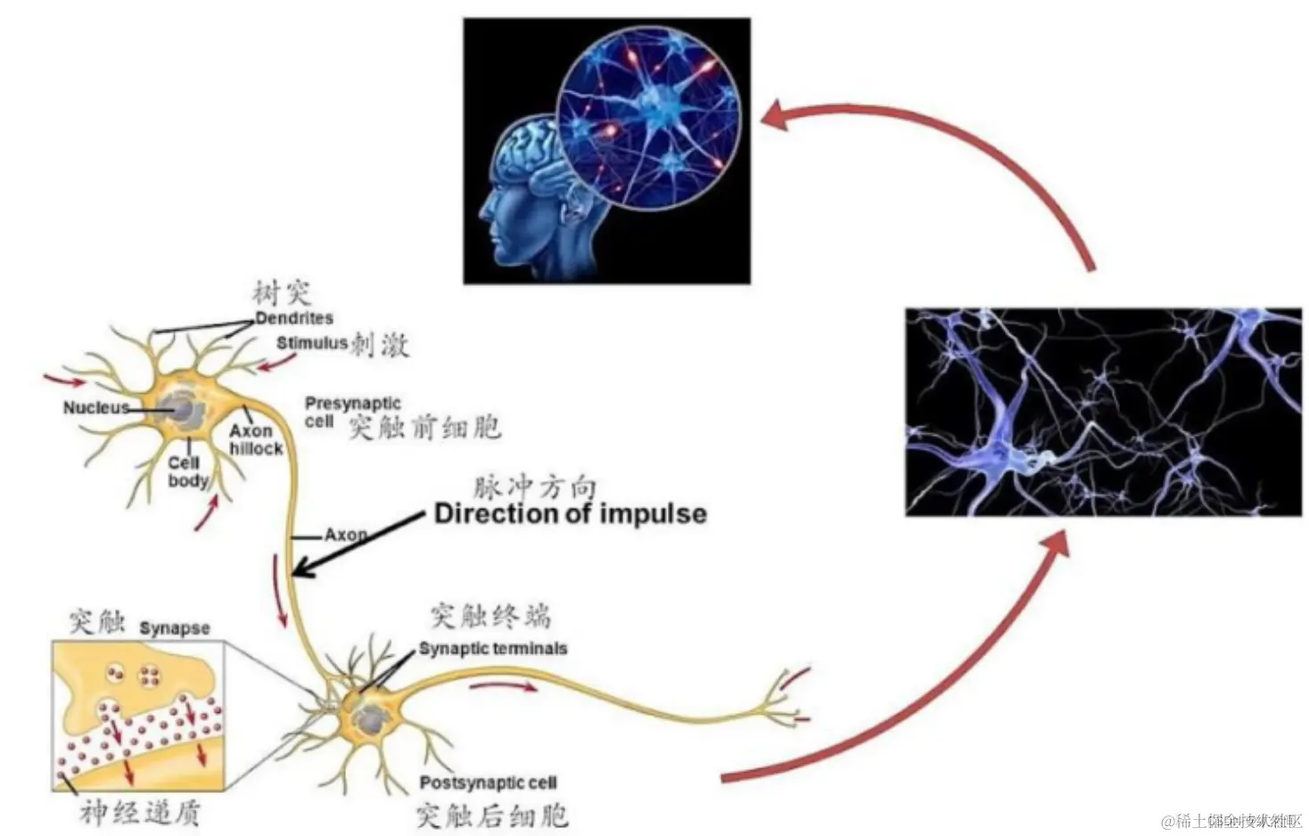 神经元的树突,树突受到递质作用后产生出电信号,从而实现了神经元间的信息传递。