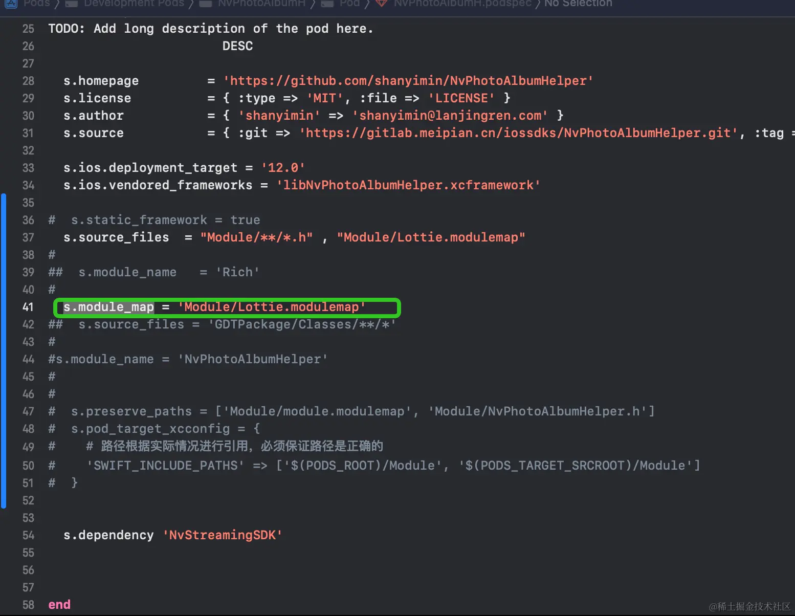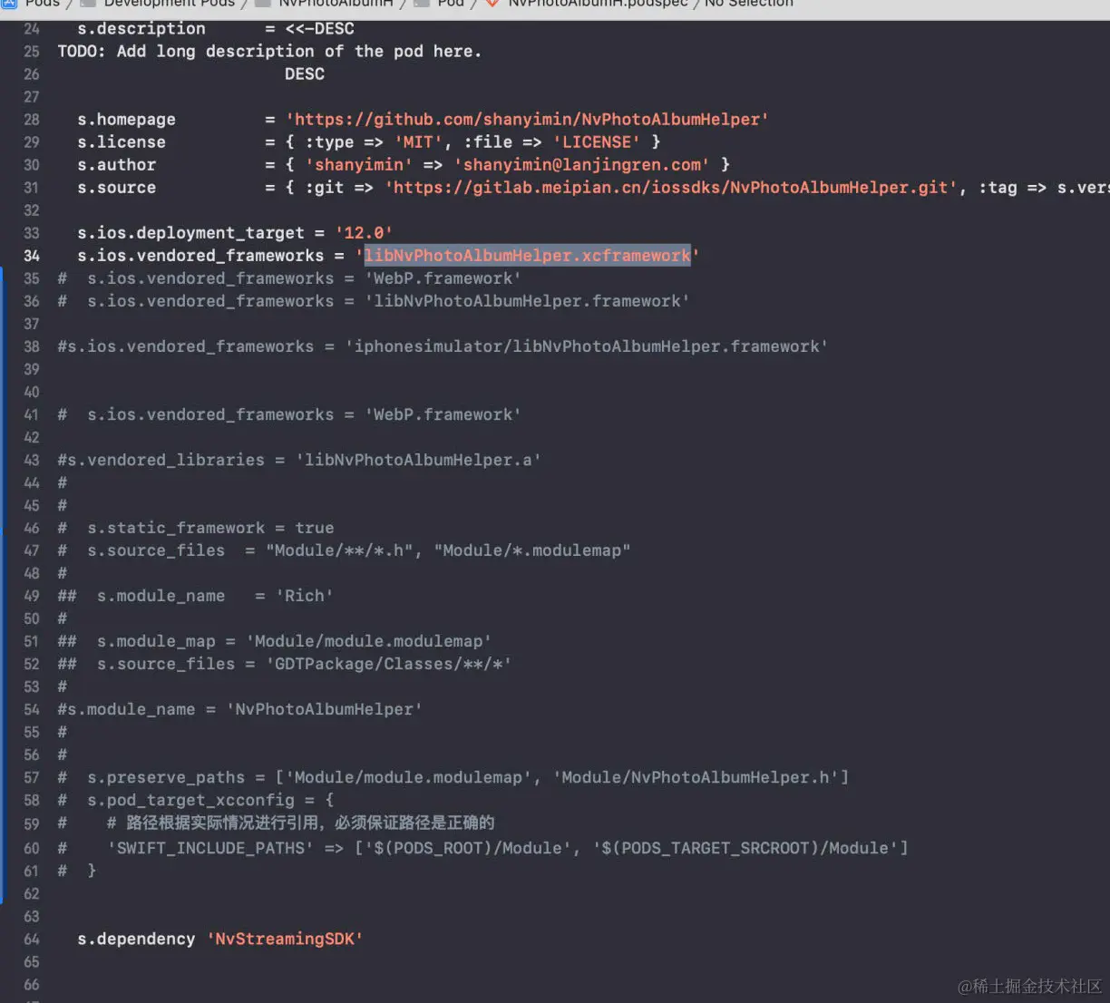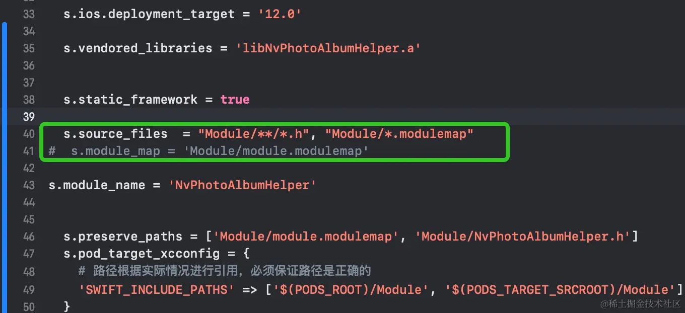 1. 如果libNvPhotoAlbumHelper.xcframework 同目录下有同名的framework libNvPhotoAlbumHelper.framework ,并且framework 有Modules/module.modulemap,在podspec中直接这么写,如下图,可以编译通过, 在主工程中直接@libNvPhotoAlbumHelper 方式引入,也可以正常使用,编程通过。 为什么?为什么?