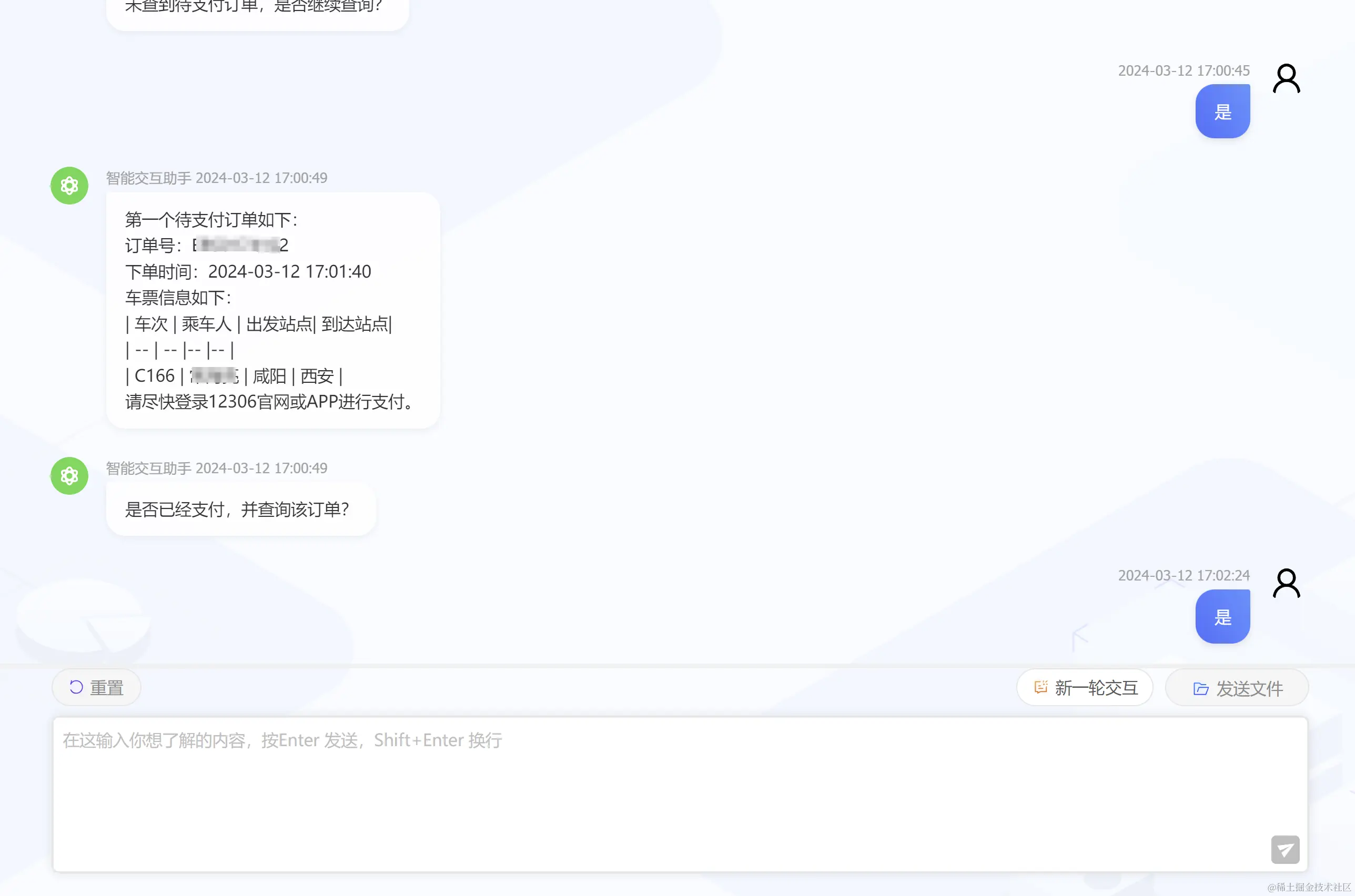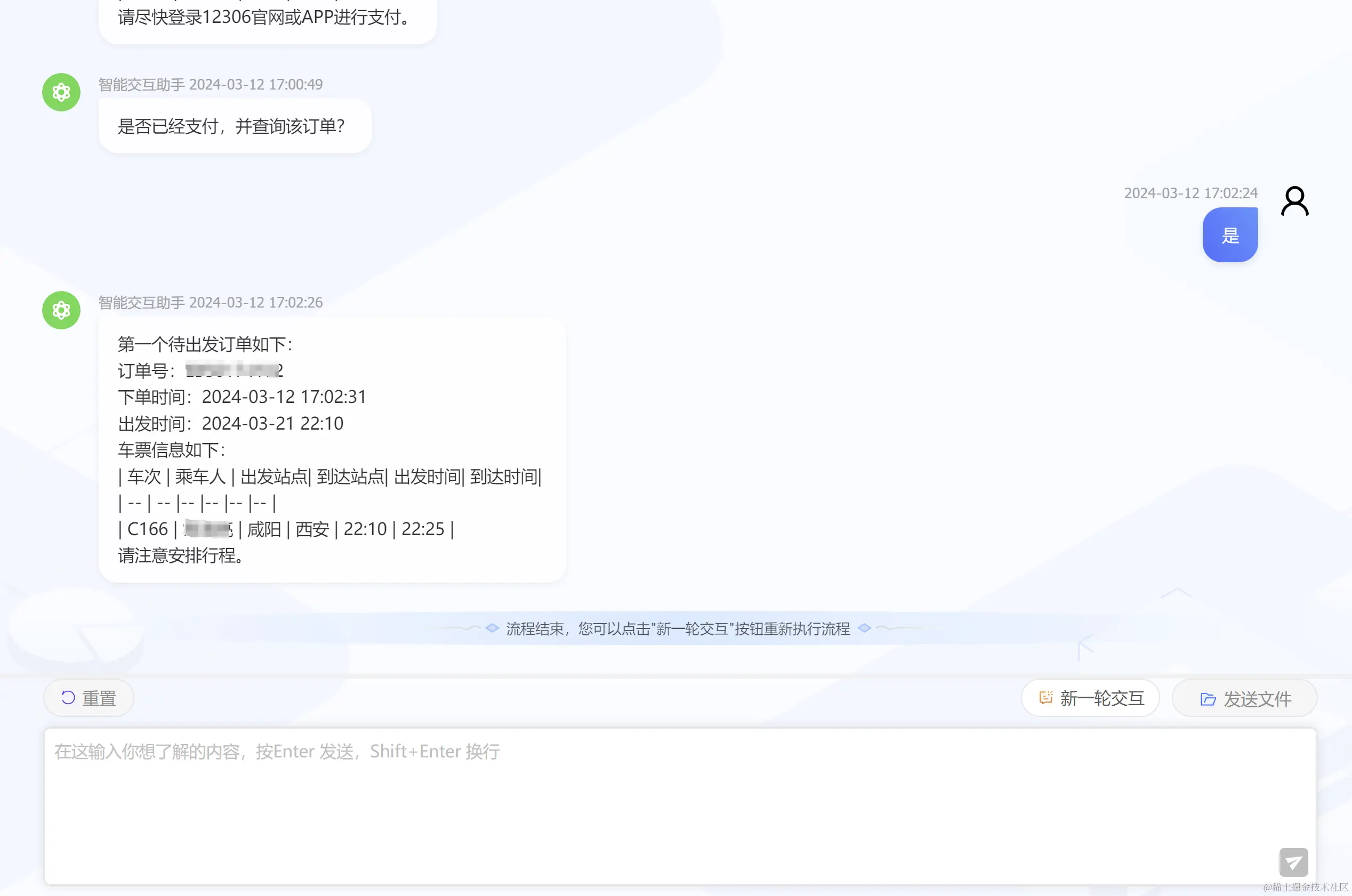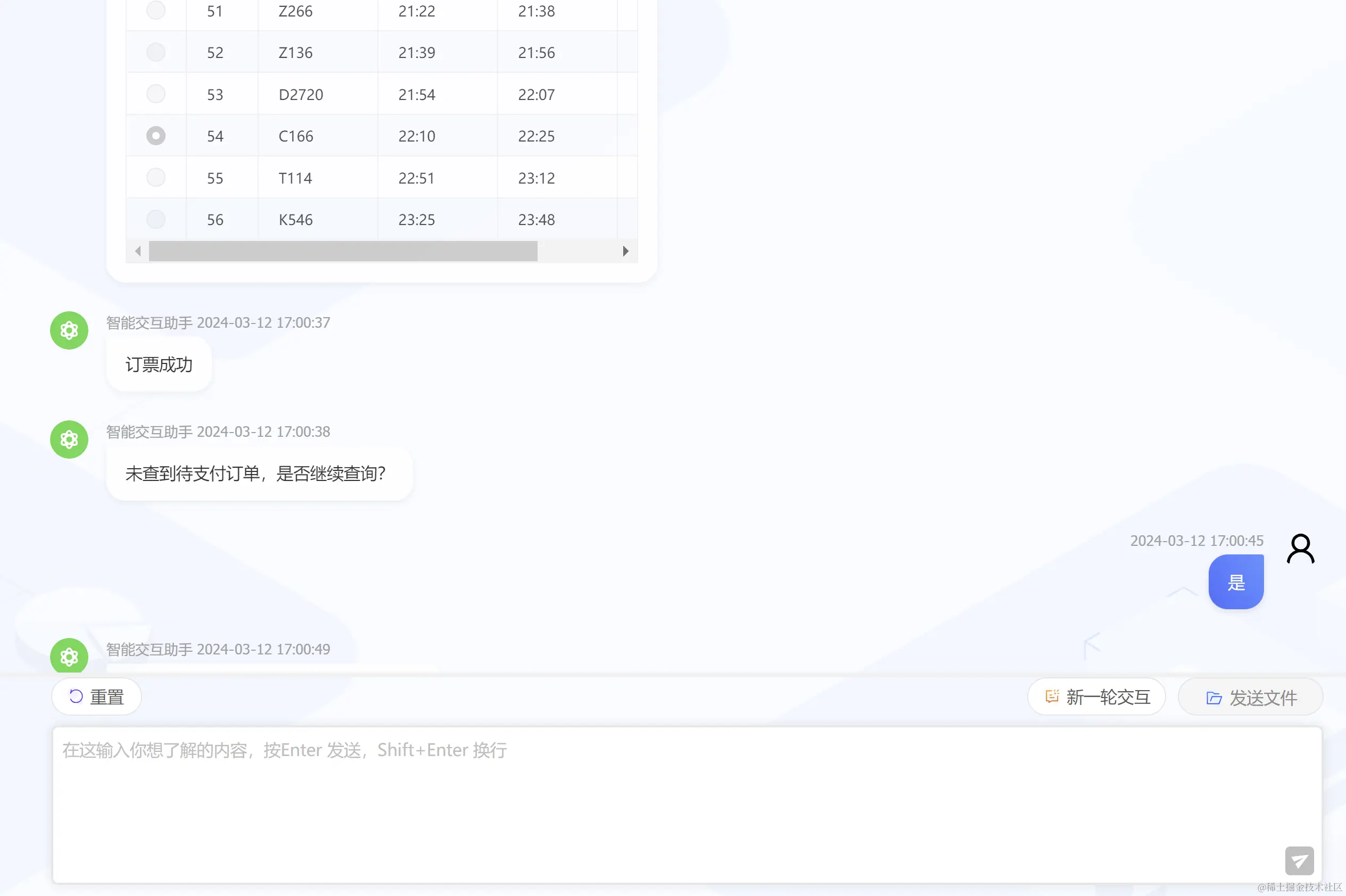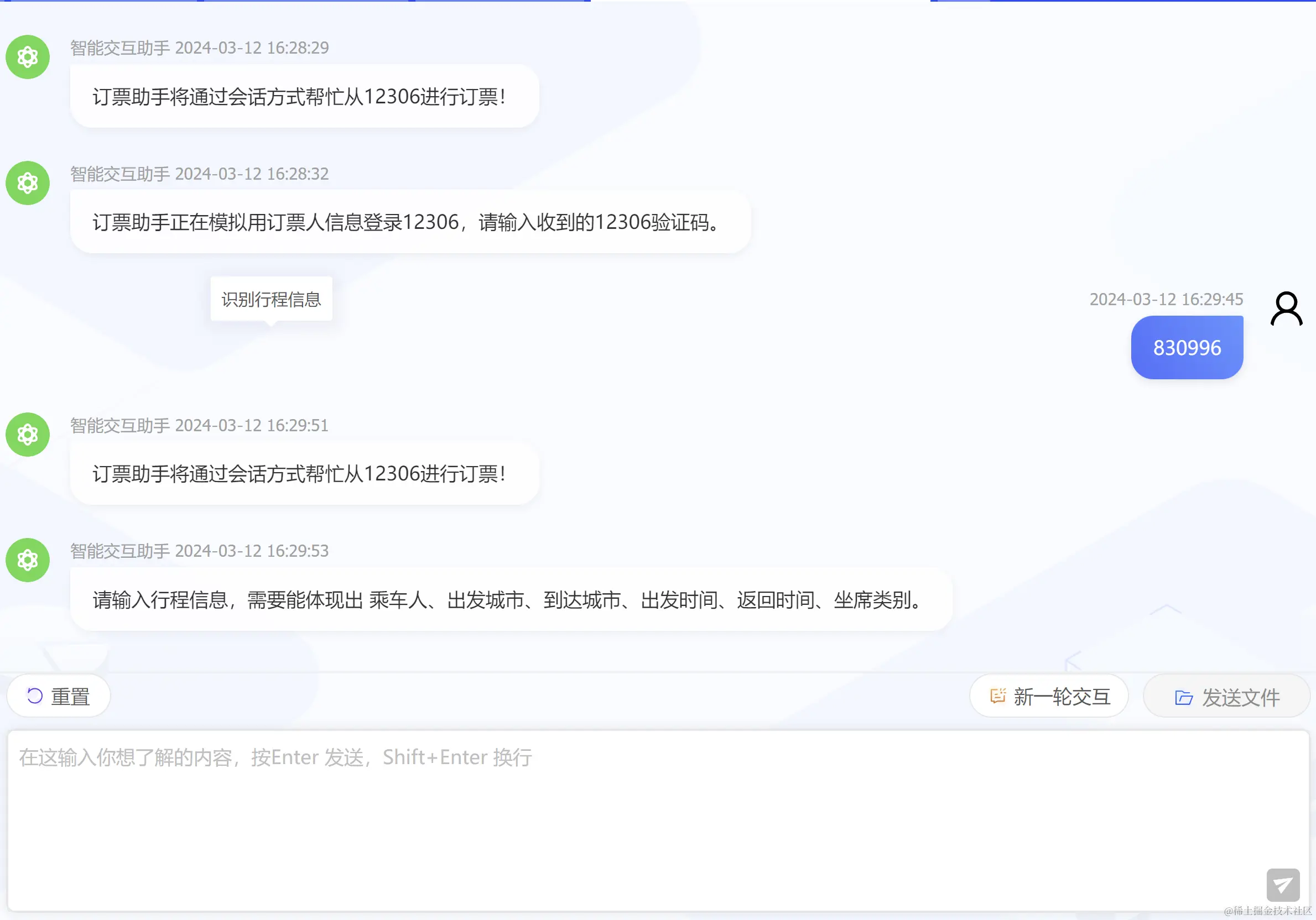 在智能订票应用中,用户仅需输入登录验证码、行程信息、选择车次,以及部分提示回复,即可快速完成车票预定。