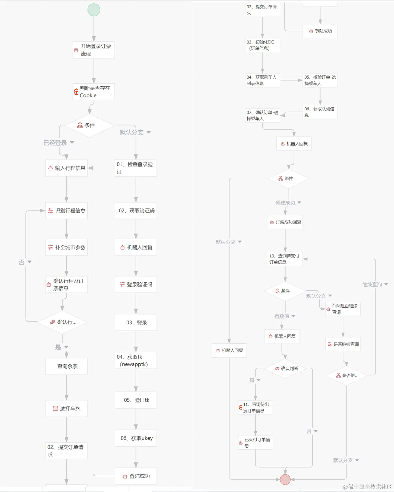 在AIGC平台Agent编排功能中,主要使用参数收集、条件、确认判断、选择等基础节点,并结合连接器12306订票流程相关操作节点,通过拖拽配置的方式,轻松构建了智能化的订票流程。