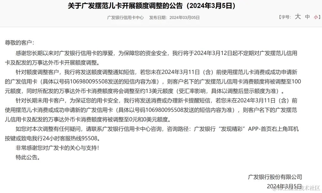 除了下线App,广发信用卡还发布相关卡产品额度调整的通知。如广发摆范儿卡,广发信用卡将于2024年3月12日起不定期对广发摆范儿信用卡及配发的万事达外币卡开展额度调整。