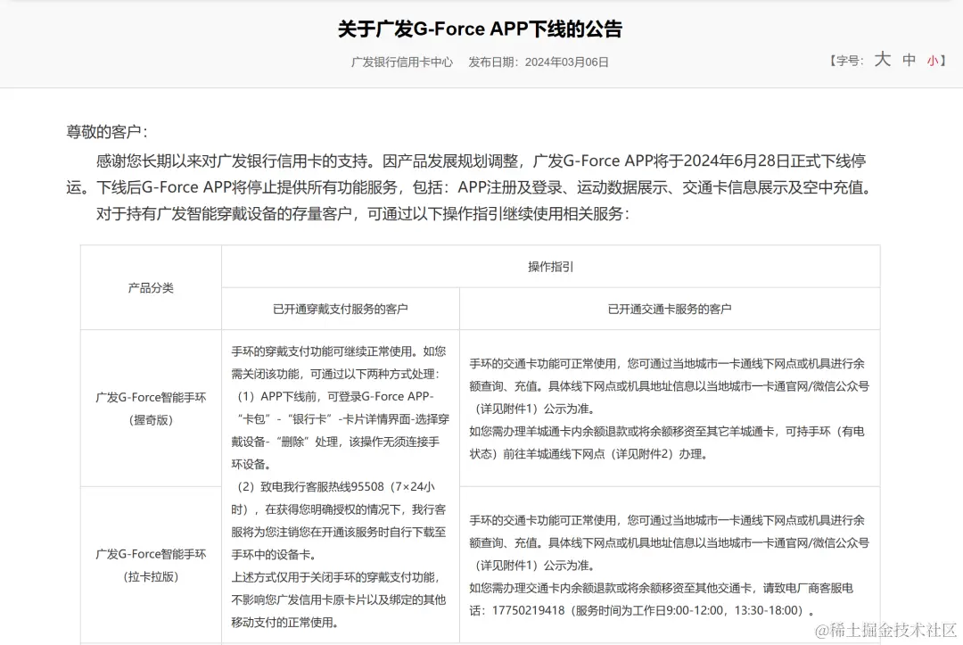 公告内容显示,因产品发展规划调整,广发G-Force APP将于2024年6月28日正式下线停运。下线后G-Force APP将停止提供所有功能服务,包括:APP注册及登录、运动数据展示、交通卡信息展示及空中充值。