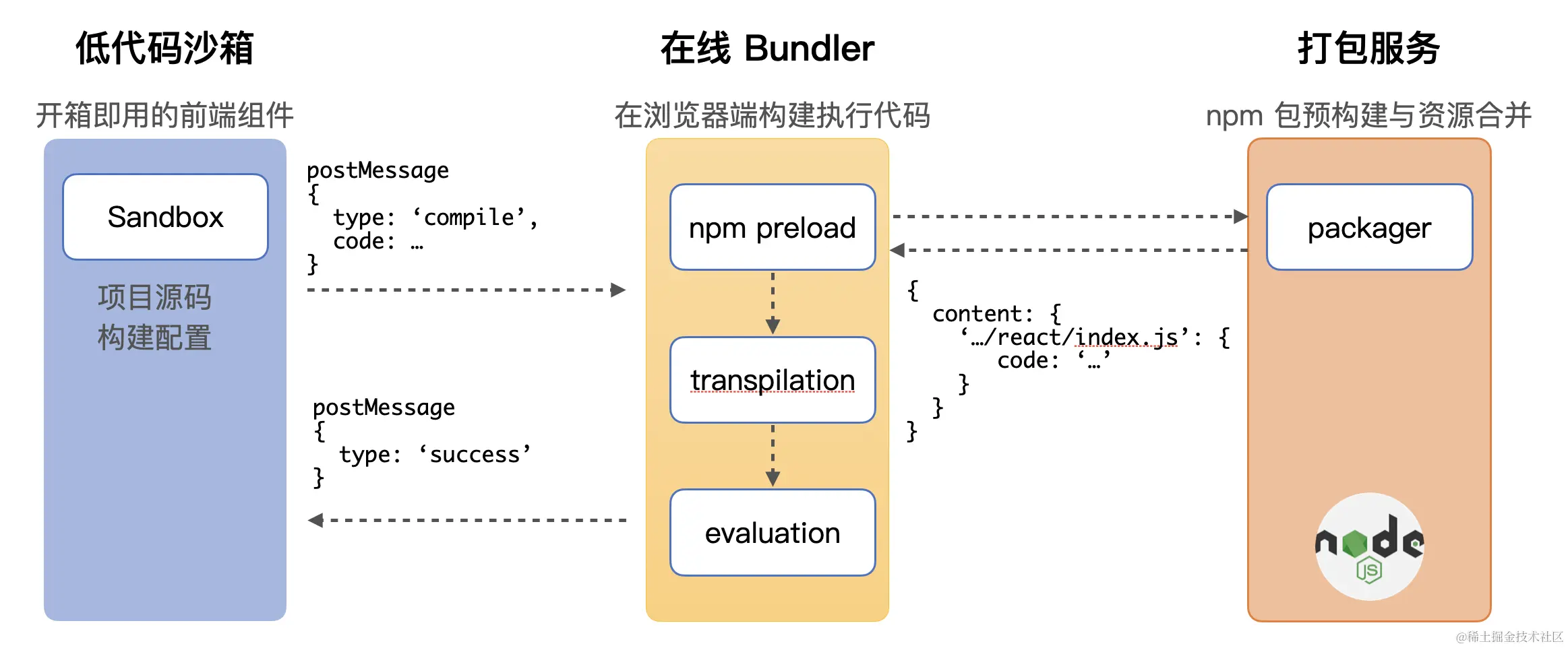 - 在线打包器:提供搭建产物的浏览器端构建能力,类似于一个浏览器版本的 webpack,最终形态是一个独立的 iframe