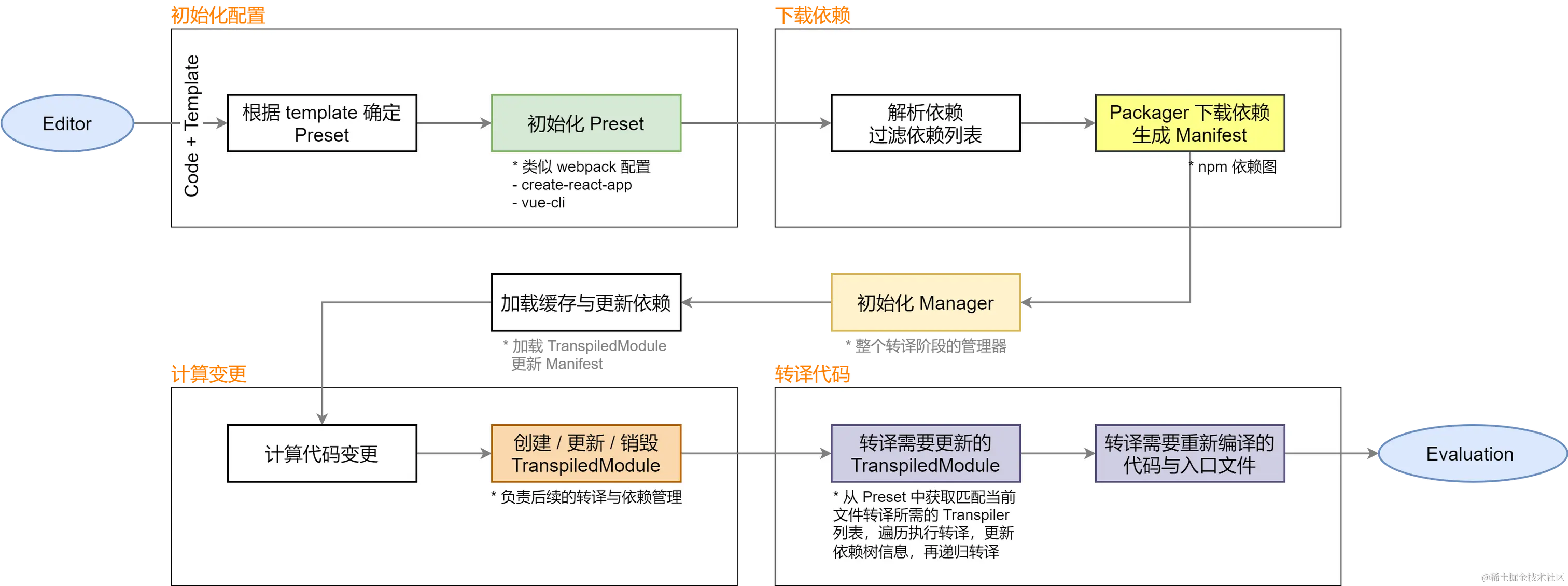 Preset 初始化好后,沙箱将初始化一个 Manager 实例,这个 Manager 实例会被 compile() 使用,用于控制整个转译流程的生命周期。然后,Manager 会按照上一节提到的方式初始化项目的依赖。如果传入的依赖发生了变更,沙箱会重新初始化一个新的 Manager 实例,避免运行时被旧的 Manager 依赖影响。