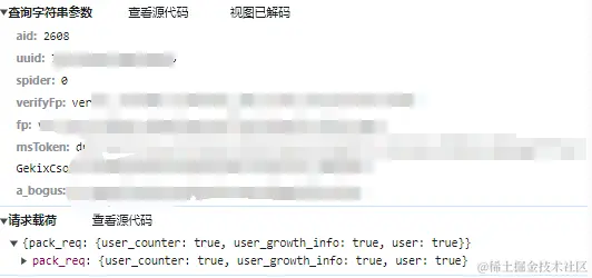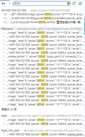 浏览器F12进 开发者模式,开下抓包,随便输入个人主页的url,如:juejin.cn/user/414261…,加载完随手搜下 掘力值 对应的数字,定位到下述接口: