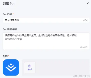 2333,工作流写完,才发现自己还建Bot,直接新建一个 掘金作者画像 的Bot,随便写下功能介绍: