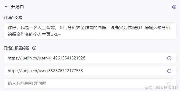 接着同样AI生成下开场白文案,预设问题随便填两个url: