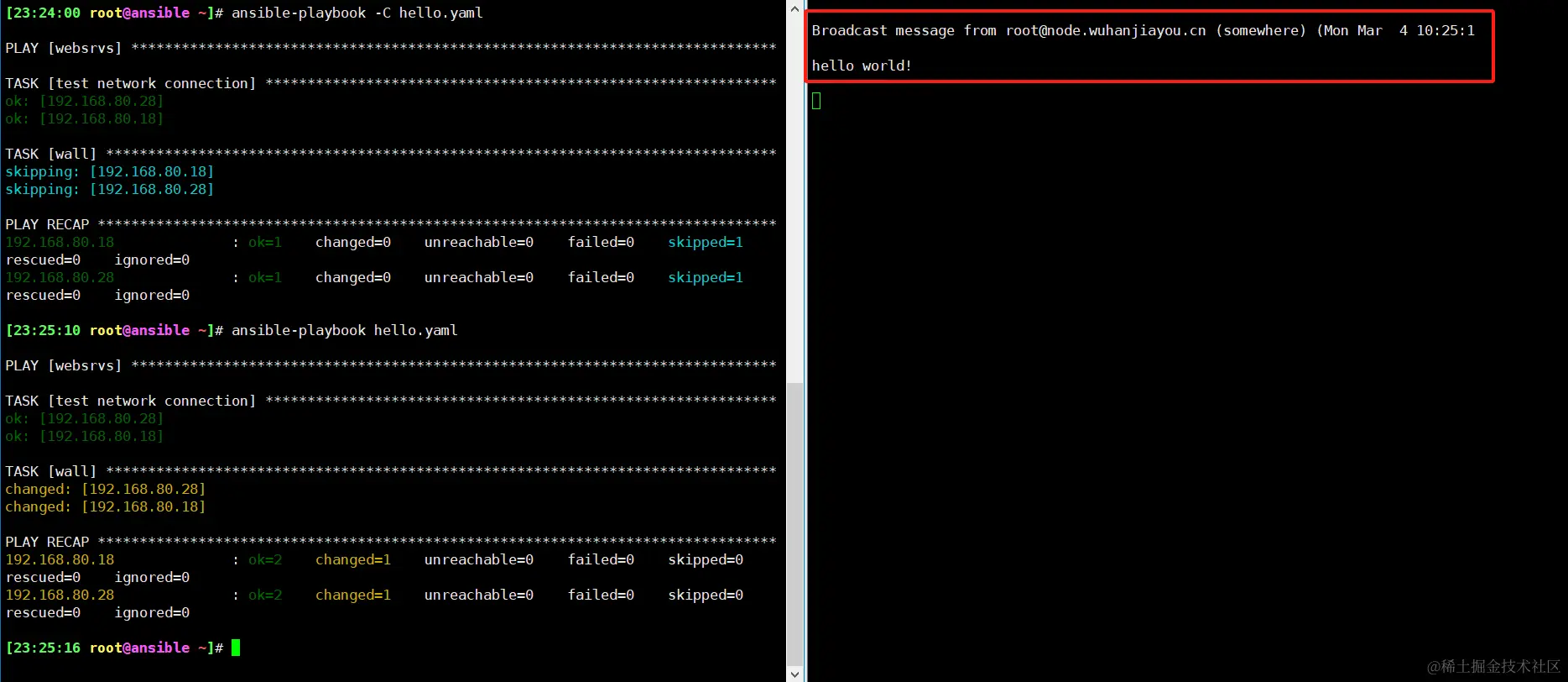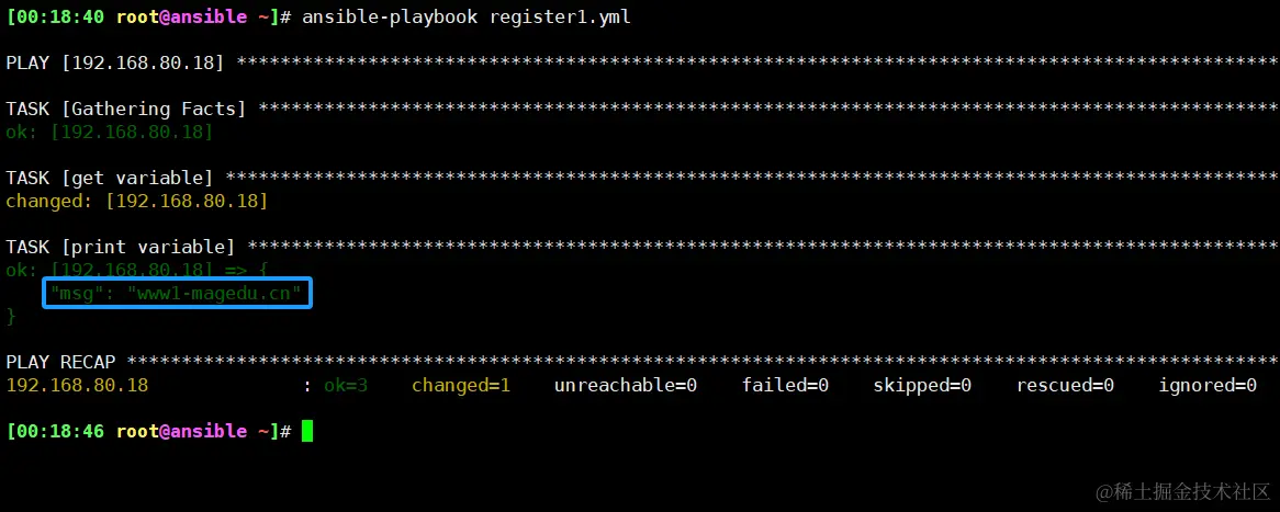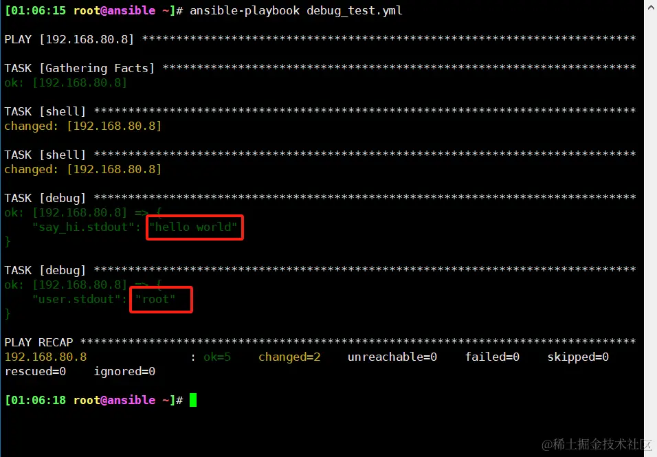 参考: blog.csdn.net/byygyy/arti…在 PlayBook 中可以使用 register 将捕获命令的输出 保存在临时变量中然后使用 debug 模块进行显示输出范例: 利用 debug 模块输出变量作用: 将 Shell 模块中命令的输出信息赋值给 register 注册变量中注意: ansible 执行结果一般都会返回一个字典类型的数据,你会看到很多你不关心的字段,可以通过指定字典的 key,例如 stdout 或 stdout_lines,只看到你关心的数据。