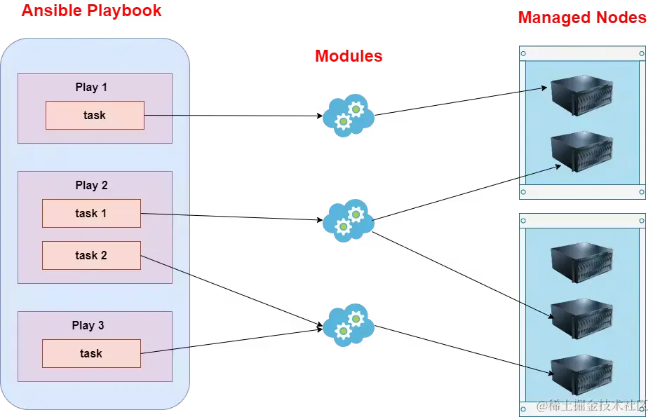 PlayBook 翻译过来就是 剧本,可以简单理解为使用不同的模块完成一件事情,具体 PlayBook 组成如下
