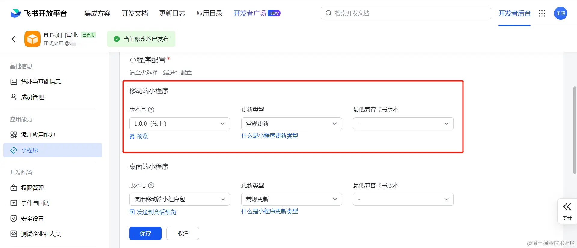 然后在飞书应用内,选择小程序版本号并保存。