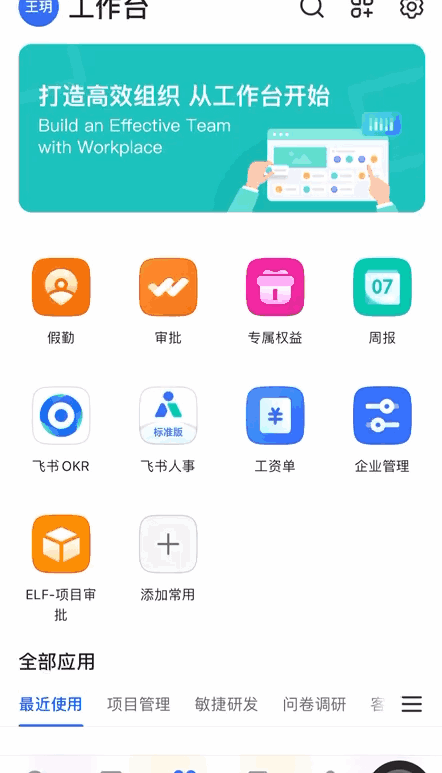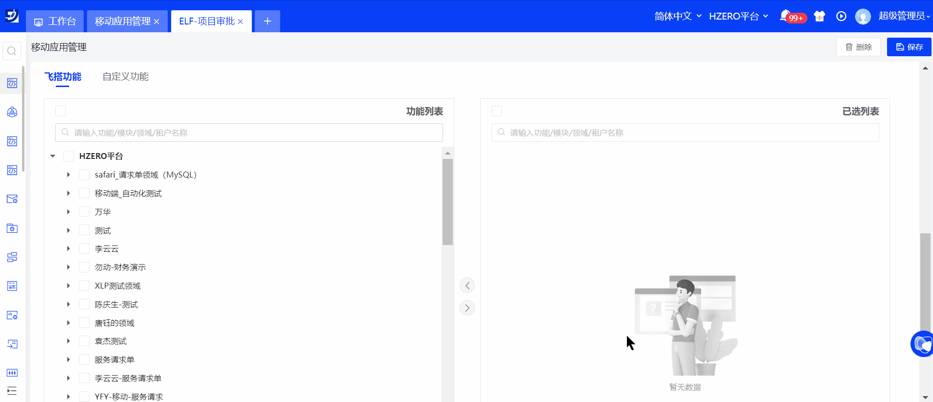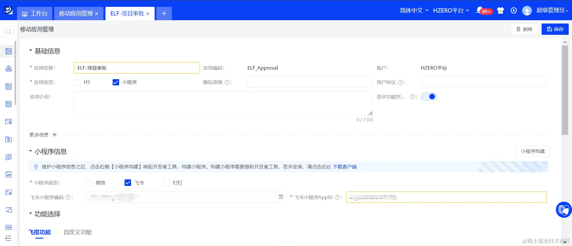 创建移动应用后需维护该应用内的功能,在功能选择模块下,选择飞搭中创建并发布的项目审批功能。