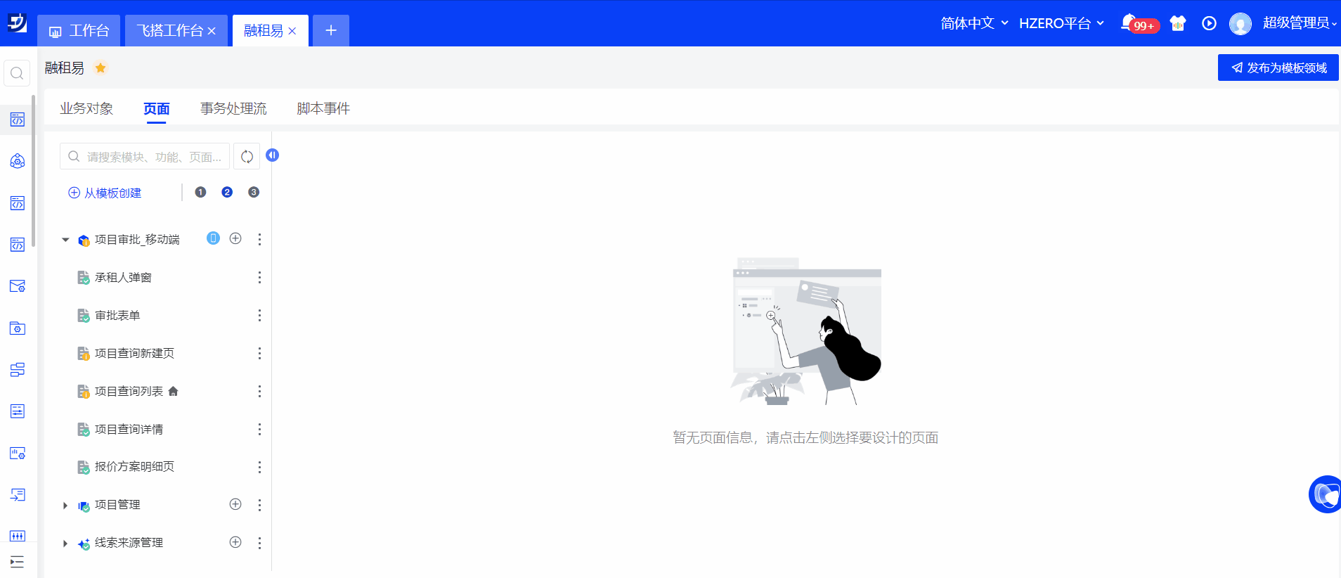 1. 页面配置与功能发布:通过飞搭提供的页面模板等功能,快速创建移动端功能、页面并发布;