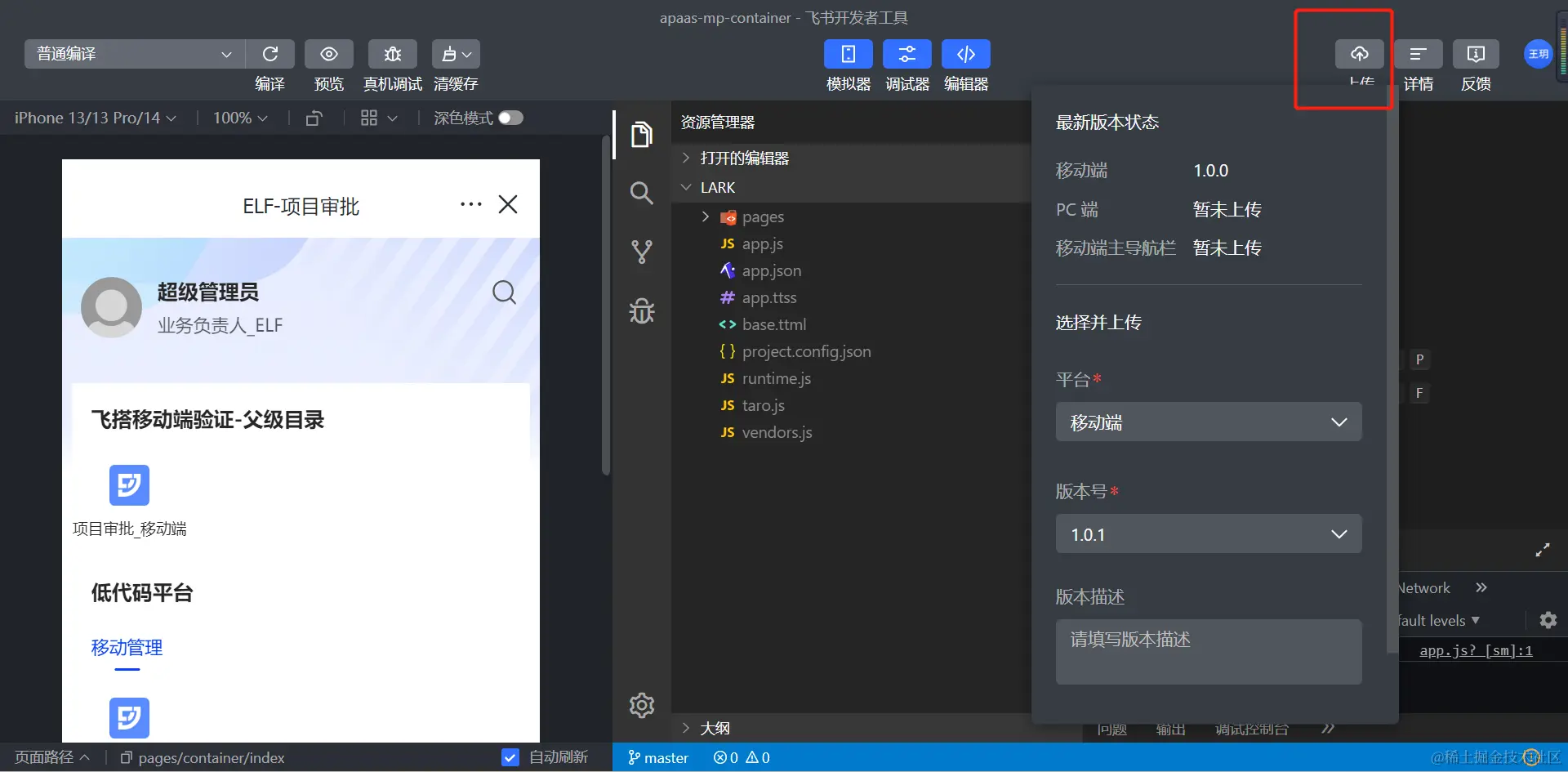 在飞书开发者工具中导入已在飞搭开发者工具中构建的小程序资源包,并上传版本;