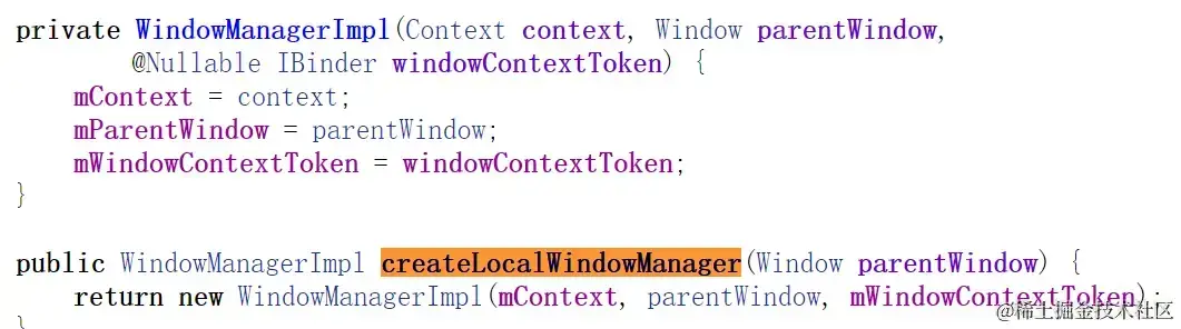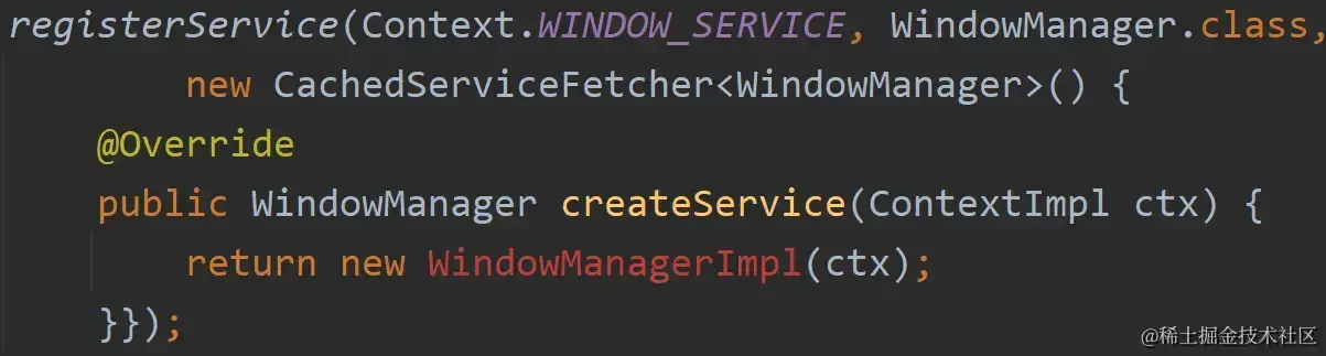 到了这里,咱们就明白了,调用context.getSystemService(WINDOW_SERVICE)会返回一个WindowManagerImpl对象,核心点就在于WindowManagerImpl的构造函数,可以看到构造函数只传入了一个ContextImpl对象,我们看下其构造方法: