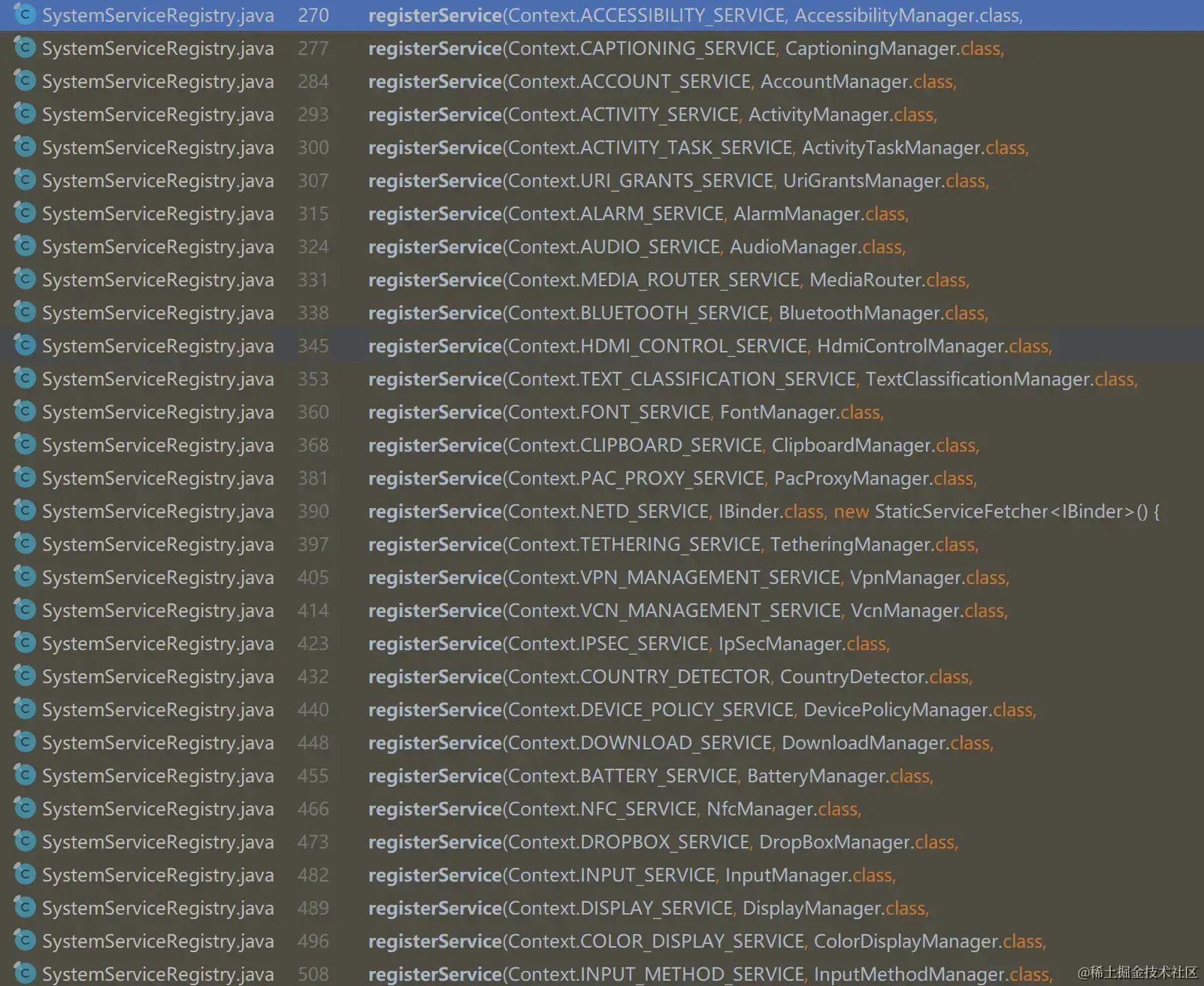 Android会在SystemServiceRegistry初始化的时候将各种服务以及服务的实现方法注册到这个集合中: