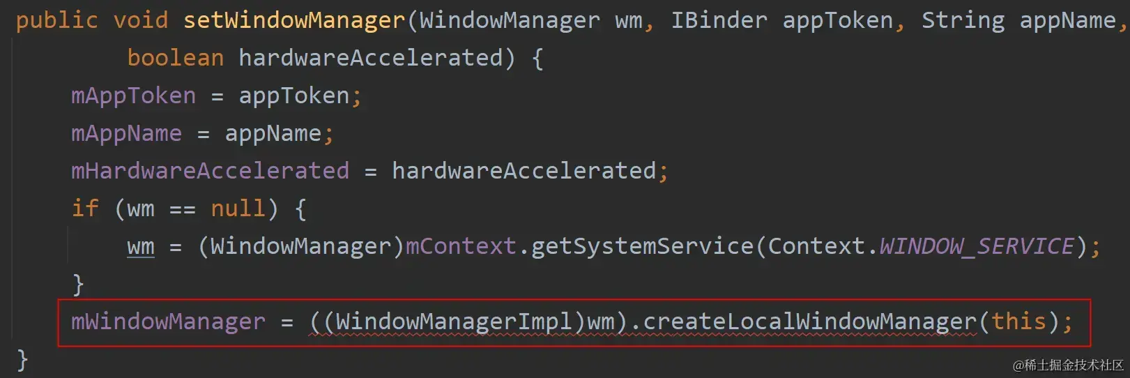 可以看到,该方法最终帮助咱们创建了WindowManagerImpl对象,关键点是其mParentWindow属性的值为上面传入的PhoneWindow,不为null。