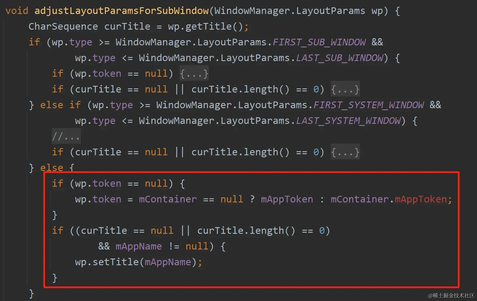 type为窗口的类型,对于Activity的窗口还是对于Dialog的窗口,其对应类型为都为2(TYPE_APPLICATION),所以最终都会走到红框中的位置,最终给window对应的layoutparam对象的token属性赋值为mAppToken。