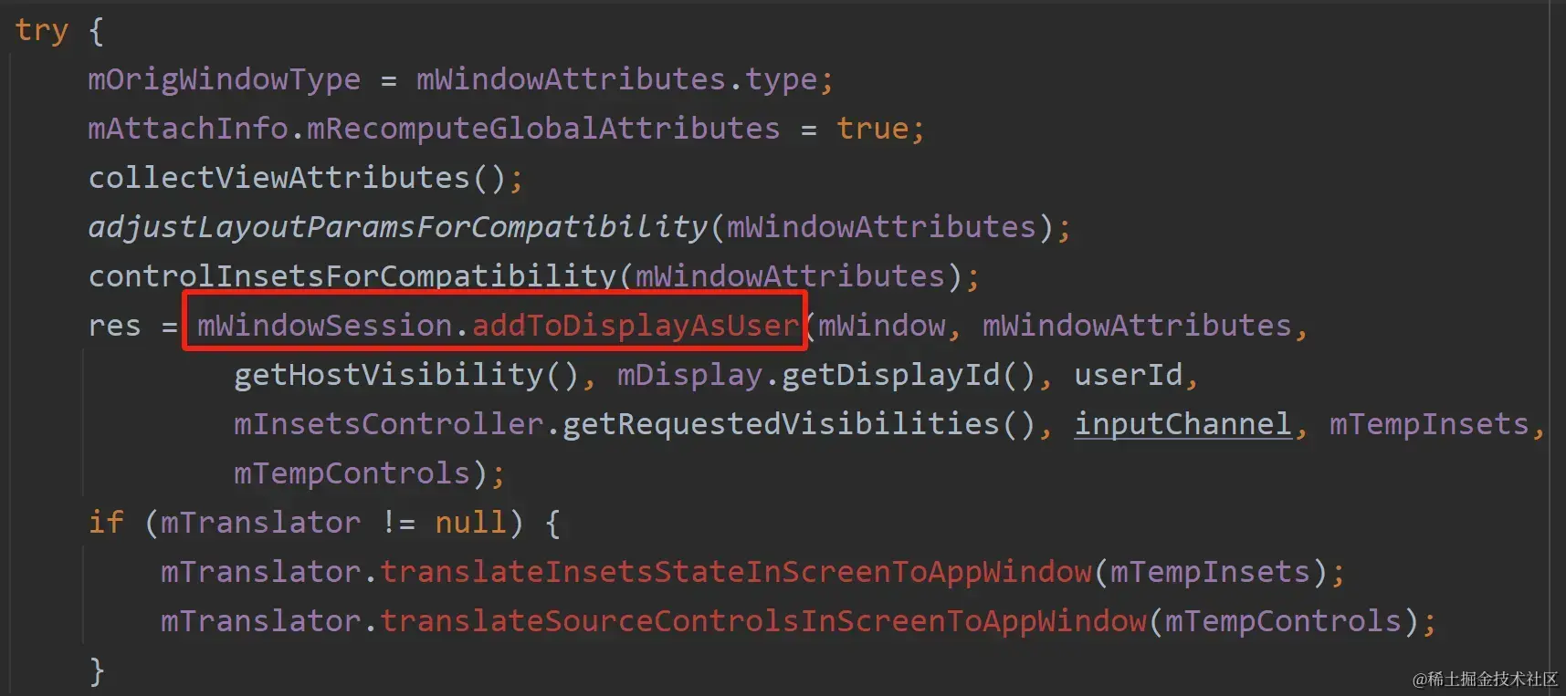 其中这个mWindowSession对应是一个Binder对象,对应类型为IWindowSession,其真正的实现位于system_server侧的Session类,所以这里会发生跨进程通信,并将window的LayoutParam类型参数进行传入,我们继续看下Session#addToDiaplayAsUser方法: