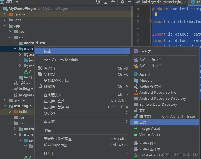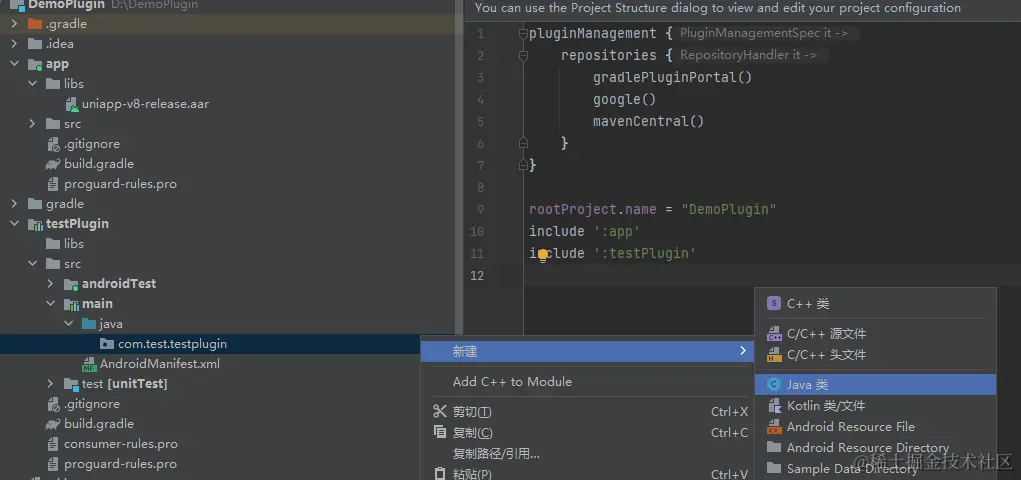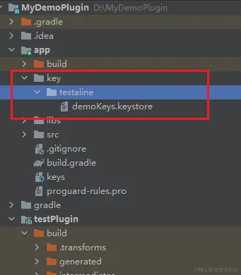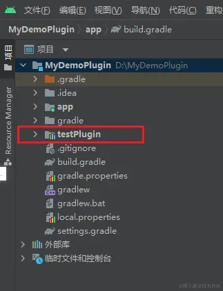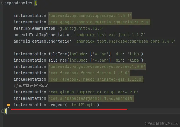 然后在build.gradle(app)下添加,implementation project(':testPlugin')用来引入本地插件