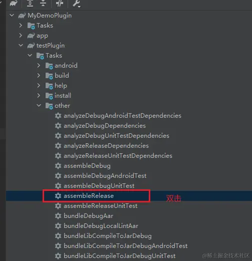打包插件到uniapp中使用,选择右侧Gradle>testplugin>Tasks>other>assembleRelease,双击assembleRelease等待系统module的arr文件。