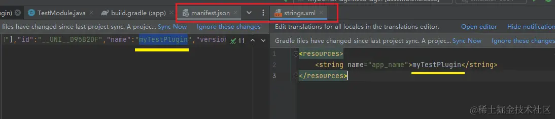 在app>src>main>res>values配置strings.xml文件,将manifest.json文件中的name配置到strings.xml文件中