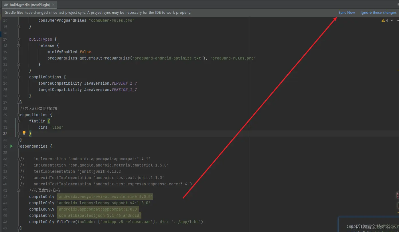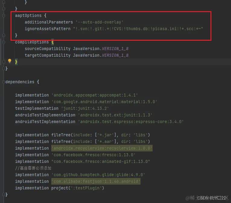 回到刚刚创建的testPlugin的build.gradle中,进行导入aar需要的配置操作,在dependencies内添加