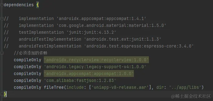 compileOnly fileTree(include: ['uniapp-v8-release.aar'], dir: '../app/libs')