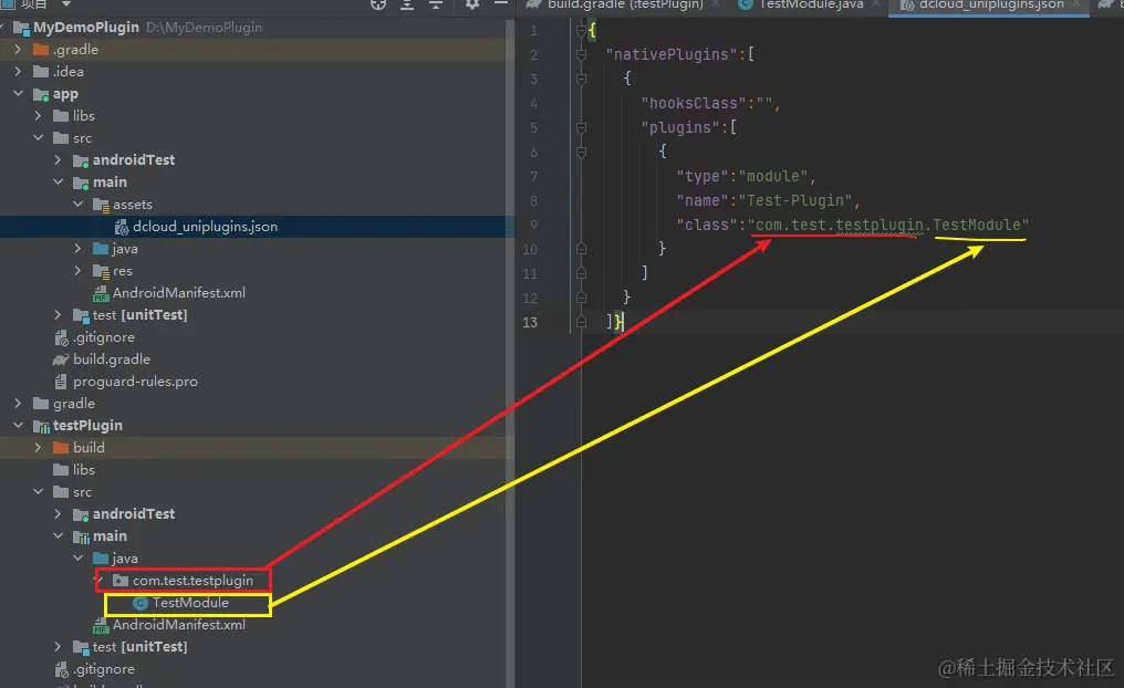 注意:插件标识id必须和name一致,plugins下的class是注册插件的类名要填对(同dcloud_uniplugins.json文件中的class一致)。配置文件为 json 格式,不能有注释,否则会解析失败。
