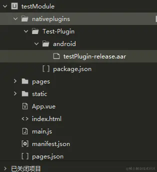 新建uniapp项目如图所示按照官方目录,创建目录nativeplugins>插件文件夹名称(最好和dcloud_uniplugins.json文件里填写的name一样)>android目录下,将刚才打包的插件放到android下,创建package.json文件,放入到插件文件夹目录下。